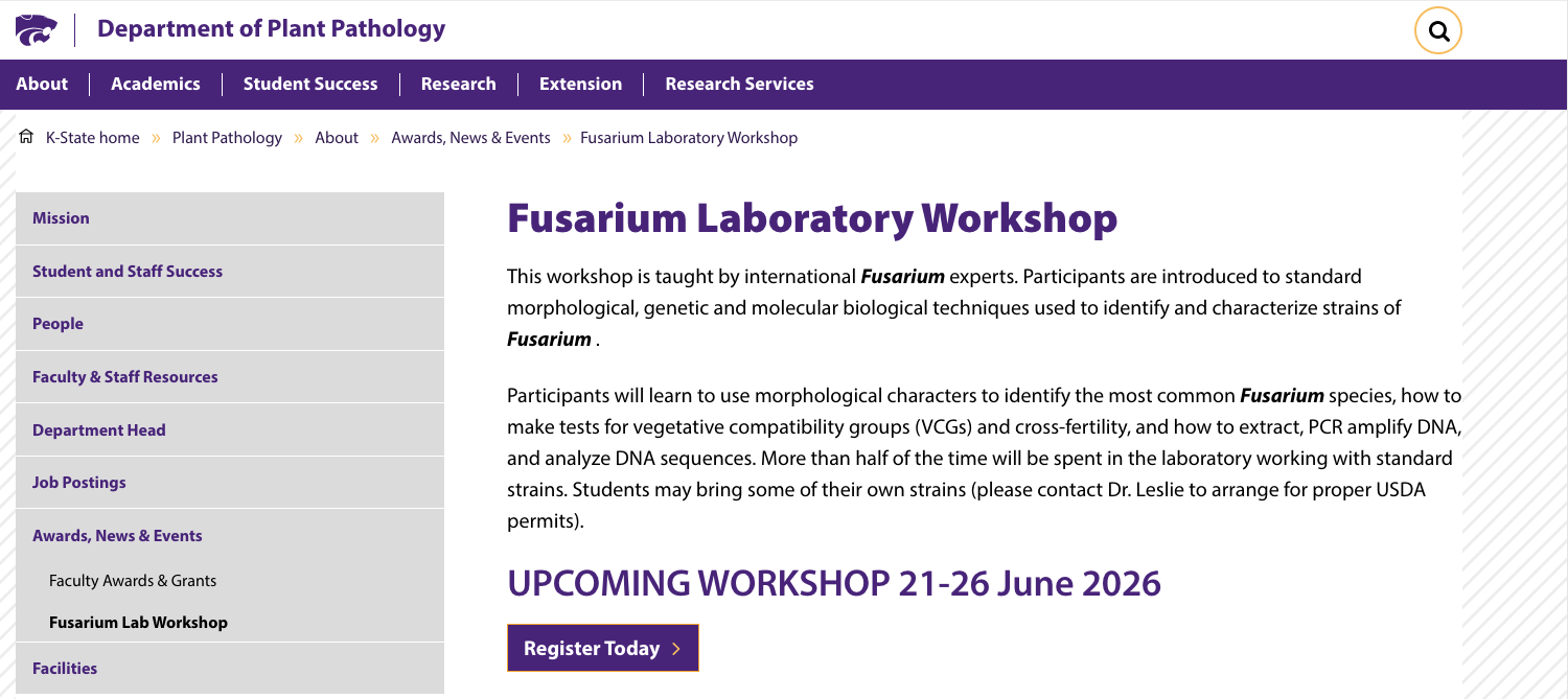 This workshop is taught by international Fusarium experts. Participants are introduced to standard morphological, genetic and molecular biological techniques used to identify and characterize strains of Fusarium .