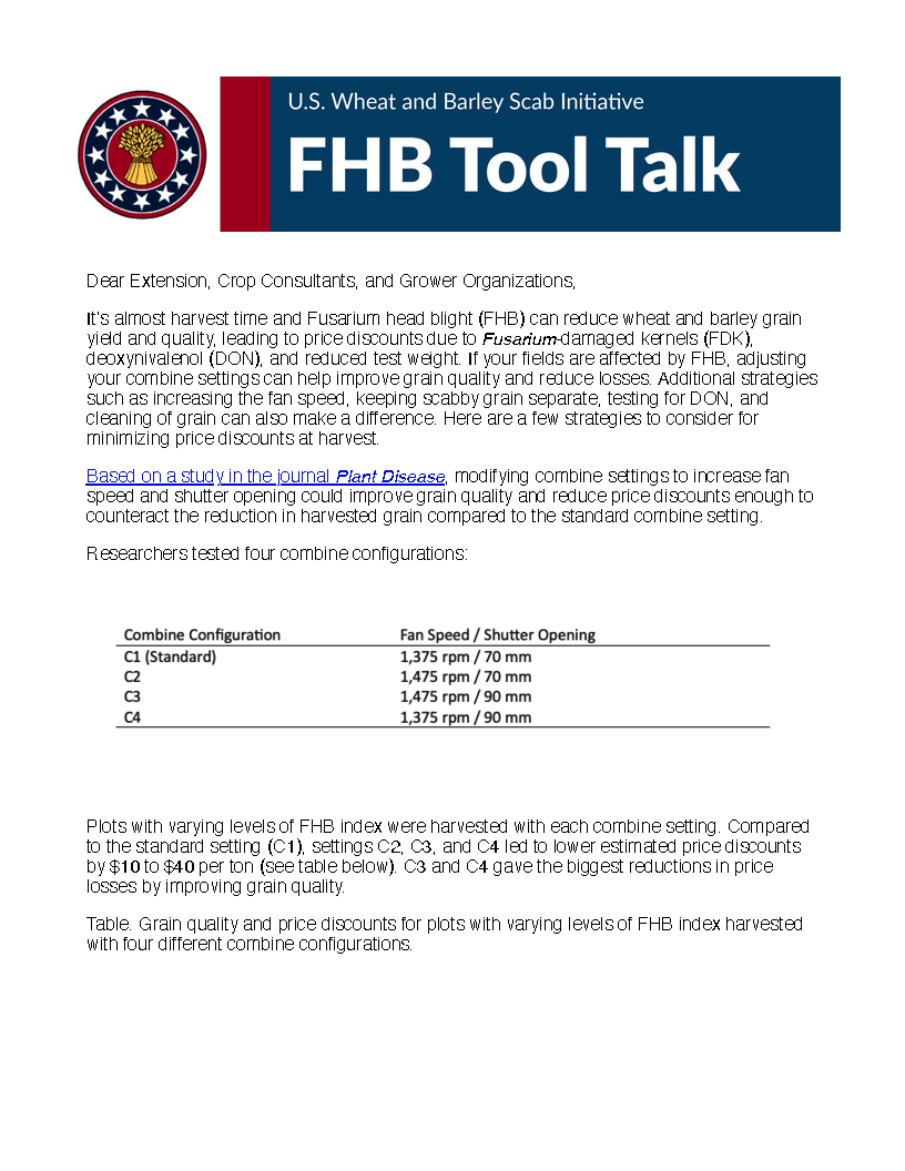 June 16, 2025: Strategies for Minimizing FHB Related Price Discounts at Harvest A few strategies to consider to minimize price discount at harvest for fields infected with FHB. Previous Newsletters